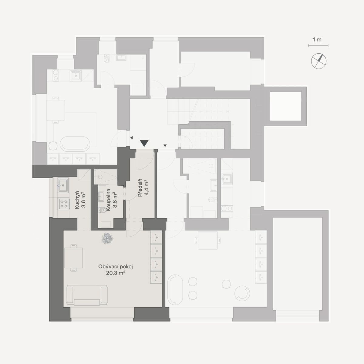 Světlý prostorný byt o dispozici 1+1 v prvním podlaží o celkové ploše 34,1 m2. Stropy jsou vysoké 2,93 m, což přidává bytu ještě více vzdušnosti. Veškeré vybavení bylo pečlivě vybráno ve spolupráci s předními dodavateli tak, aby splnilo náročné požadavky jak na design, tak užitnou hodnotu. K bytu je nutností přikoupit jedno parkovací stání. Orientace bytu je na jižní stranu.